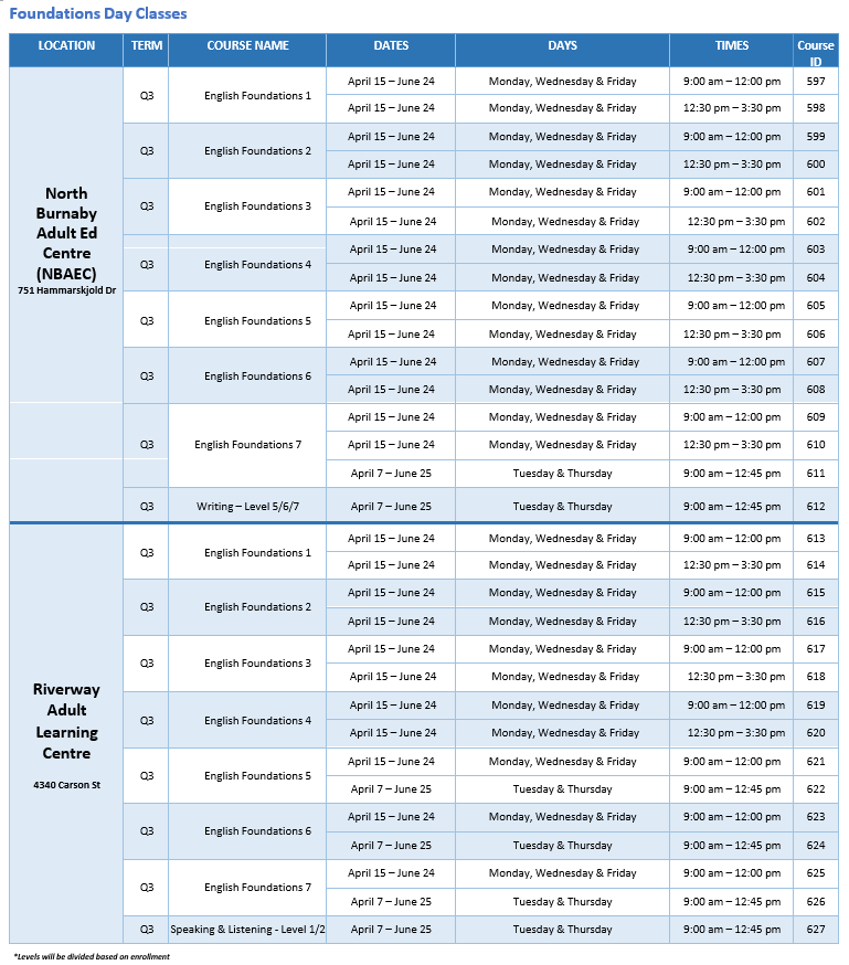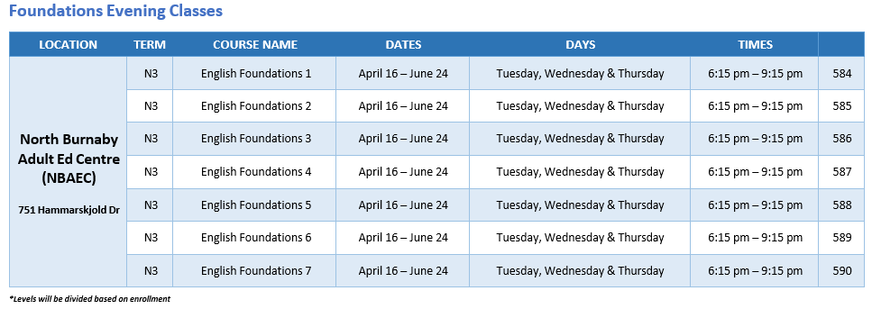 The Foundations program is designed for adults to strengthen basic skills in English in preparation for both employment and further studies. Foundations courses are transition or bridging classes that prepare students for regular Grade 10, 11, and 12 courses. The learning outcomes of the Foundations program are designed to address literacy and needs up to the grade 10 level.