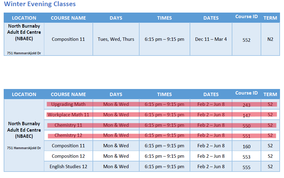 Please make sure the course you are interested in is being offered in the current course schedules before registering. For online courses, please contact the Burnaby Online office.